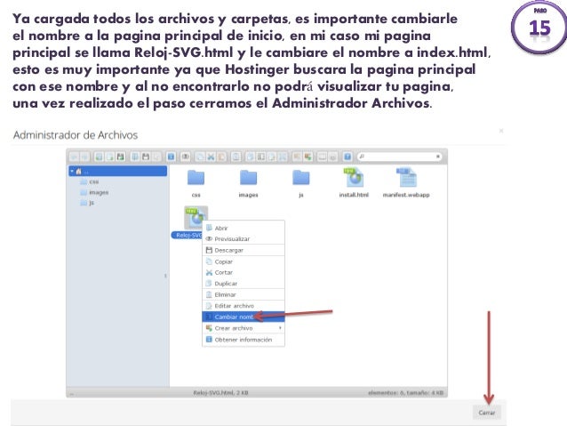 13.  Ya cargada todos los archivos y carpetas, es importante cambiarle el nombre a la pagina principal de inicio.